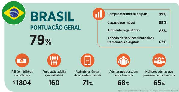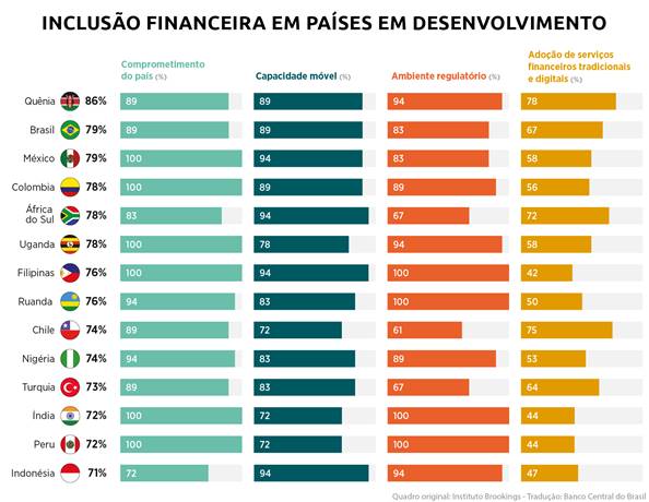 O Brasil avançou uma posição e ficou em segundo lugar em levantamento que analisa a evolução da inclusão financeira e digital em 26 países em desenvolvimento. A pesquisa é realizada pelo Instituto Brookings desde 2015 e avalia quatro dimensões da inclusão financeira: o comprometimento do país com o assunto, a capacidade móvel, o ambiente regulatório e a adoção de serviços financeiros tradicionais e digitais. O Brasil foi mais bem avaliado nas dimensões comprometimento com o tema e capacidade móvel.